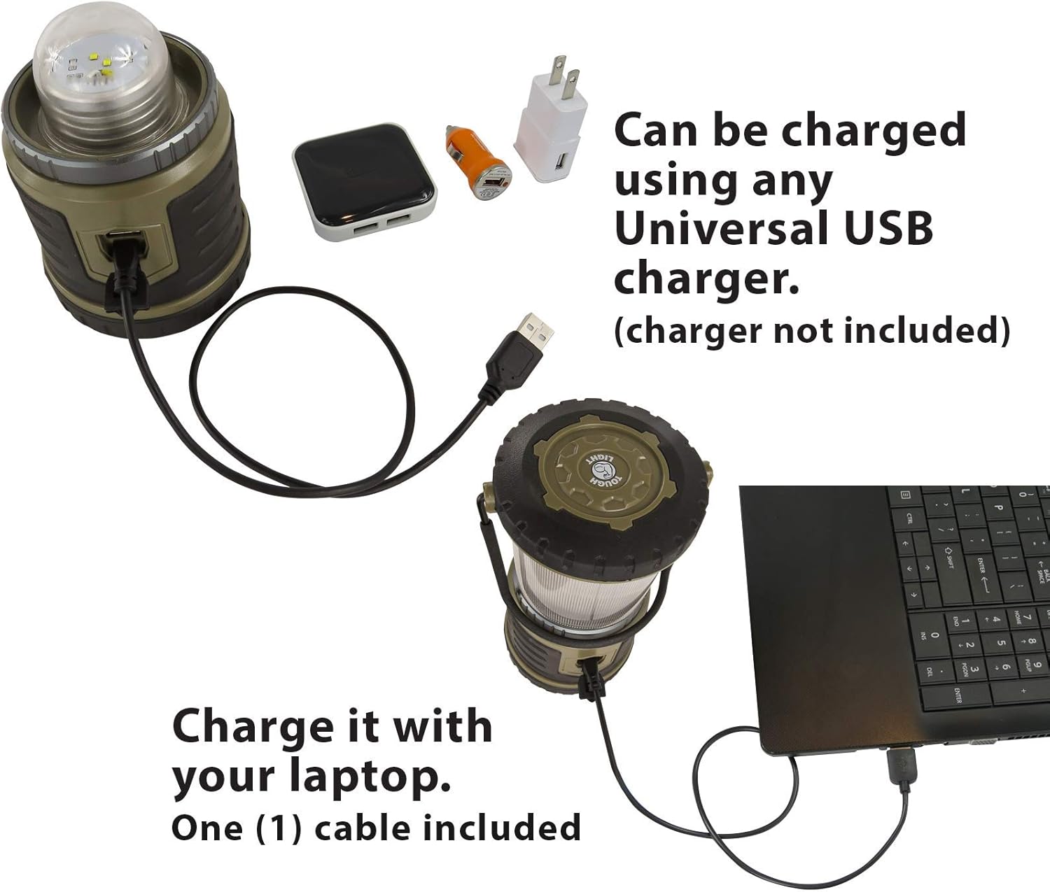 - SAVE MONEY: Up to 50,000 hours of use, equivalent to buying 12,500 "D" batteries. CHARGING CABLE INCLUDED, CHARGER BLOCK NOT INCLUDED: Unit can be charged from any USB charger block. The same USB charger that you use for your smartphone, tablet or digital camera will also work to charge the Tough Light. You can charge it in your car using any USB 12-volt DC charger or from any WORLDWIDE USB power source.