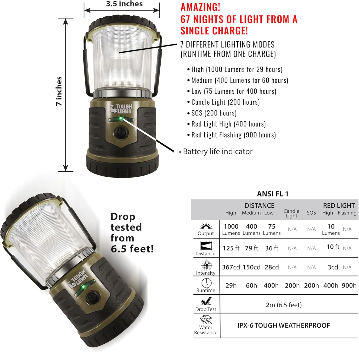- WATER AND DROP RESISTANT: Military-grade rubber and plastic molds with built in rubber O-rings, provides IPX-6 water resistance to handle wet conditions. This Tough Light is durable and can handle a drop from 6.5 feet without damage.