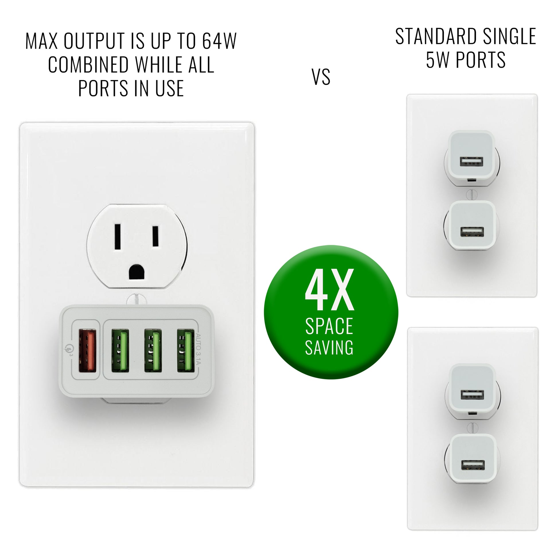 - NEW 4 PORT SPACE SAVER DESIGN: The New Space Saver Design is turned sideways so it only covers one outlet but still offers 4 charging ports!