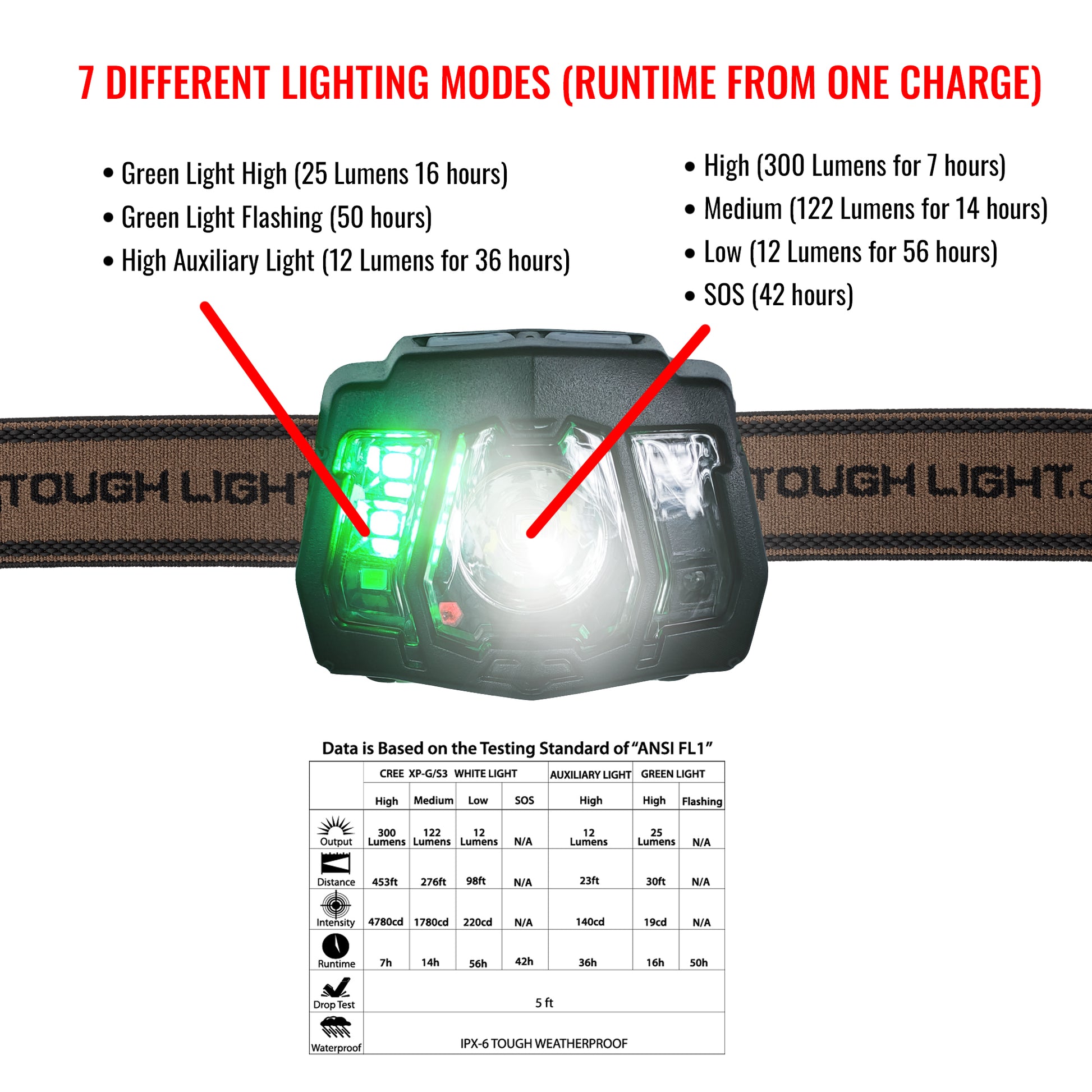 - 7 DIFFERENT LIGHTING MODES: High, Med, Low, S.O.S. Aux White, GREEN NIGHT VISION, Green Flash.